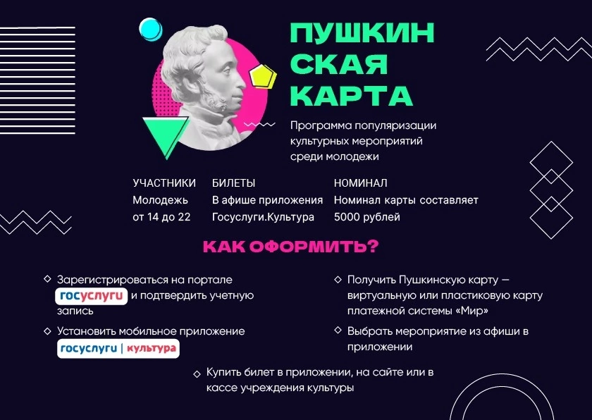 Дорогие друзья, не забудьте оформить  Пушкинскую карту, ведь она представляет собой уникальный социальный проект, направленный на популяризацию национальной культуры среди молодёжи. Пушкинская карта - пропуск в мир музыки, театра, книг, музеев и КИНО!