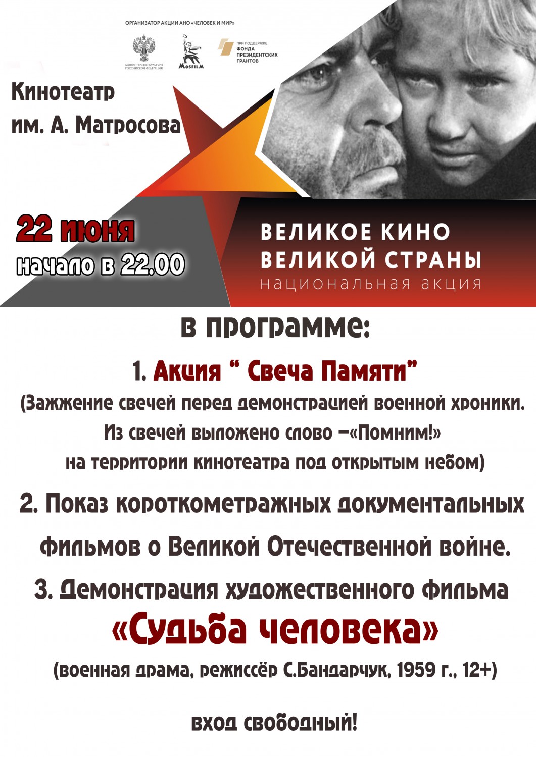 Уважаемые кинозрители! Спасибо огромное тем, кто принял участие 22 июня в Акции "Великое кино Великой страны" и пришёл отдать дань уважения и памяти всем, кто прошёл войну и тем, кто не вернулся.
