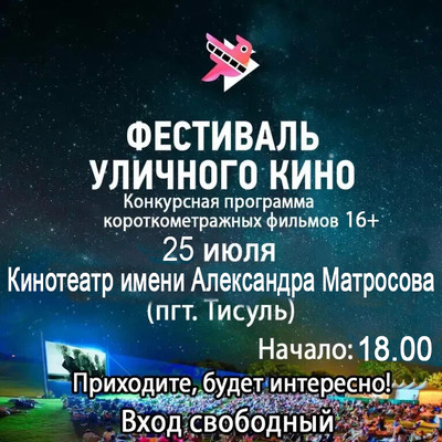 Дорогие земляки – Тисульчане и гости нашего округа! Приглашаем вас в кинотеатр имени Александра Матросова 25 июля в 18.00 на Фестиваль уличного кино.