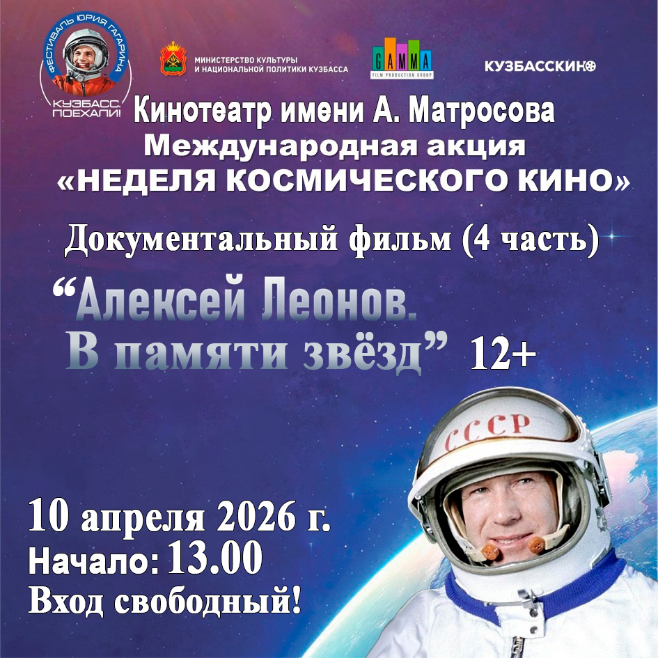 В рамках Международной недели космического кино кинотеатр имени Александра Матросова 10 апреля в 13.00 покажет документальный фильм “Алексей Леонов. В памяти звёзд”. Это четвёртая часть документального ... Читать дальше »